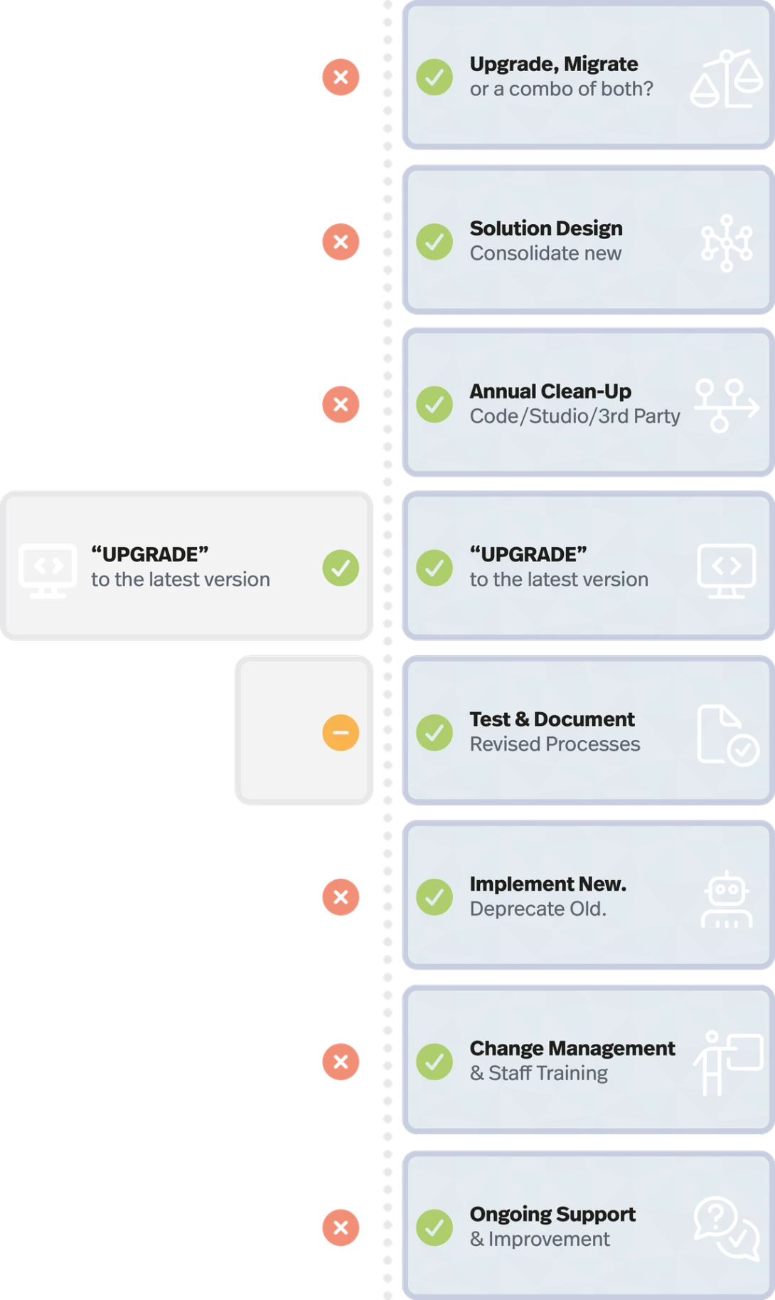 We execute the strategic transition by activating new features while decommissioning outdated customisations to streamline your system.